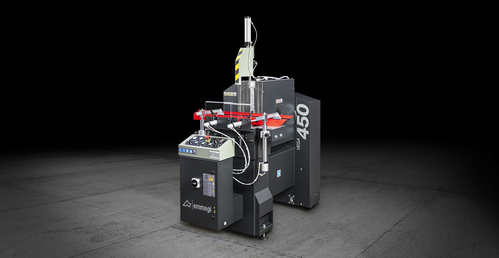 Electronic double-head cutting off machine with automatic movement of the mobile head through a C.C. motor controlled by numerical control. Pneumatic management of all angles up to 22°30’ (external). 450 and 500 mm-blade. Available with a useful cut of 4, 5, 6 m in length.